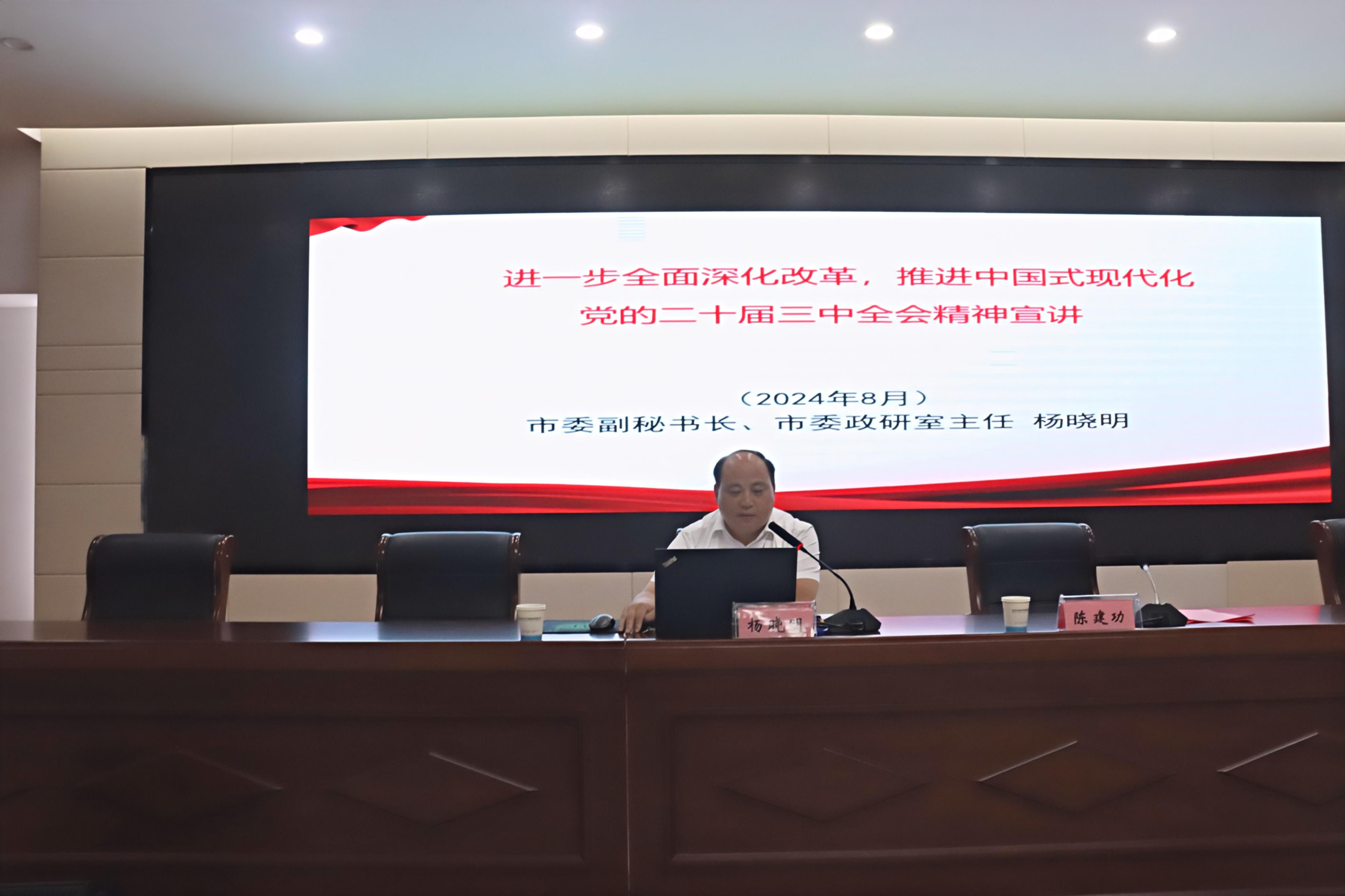 楊曉明以《進(jìn)一步全面深化改革推進(jìn)中國式現(xiàn)代化》為主題,緊緊圍繞習(xí)近平總書記在黨的二十屆三中全會(huì)上的重要講話和全會(huì)《決定》,從深刻認(rèn)識(shí)進(jìn)一步全面深化改革的重大意義、全面把握黨的二十屆三中全會(huì)的改革重點(diǎn)、以釘釘子精神抓好改革落實(shí)和從《決定》看國資國企高質(zhì)量發(fā)展方向四個(gè)方面,對(duì)全會(huì)精神進(jìn)行了系統(tǒng)闡述和全面講解,并結(jié)合蚌埠市工作實(shí)際,進(jìn)一步解讀了全面深化改革的主旨要義。