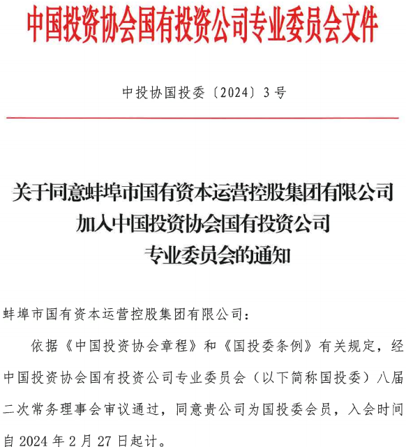 熱烈祝賀蚌埠國(guó)控集團(tuán)加入中國(guó)投資協(xié)會(huì)國(guó)有投資公司專(zhuān)業(yè)委員會(huì)
